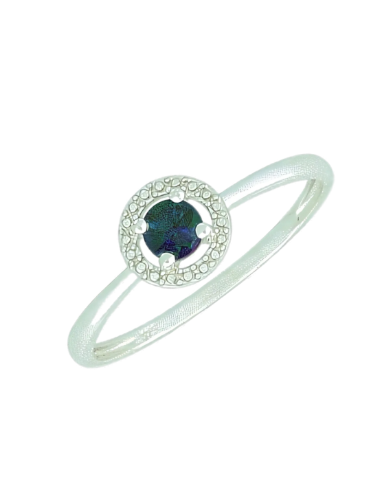 ce solitaire en or blanc 750‰ met en lumière un saphir bleu rond de 0,26 ct, serti en griffes pour une brillance optimale. Autour de la pierre, un pourtour d’or blanc ciselé crée un superbe effet diamanté, apportant éclat et modernité sans alourdir le design. Avec sa finition polie et son élégance épurée, cette bague féminine se distingue par son raffinement intemporel et son style lumineux.